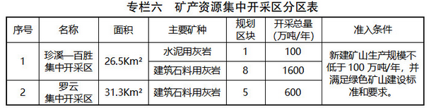 1)珍溪—百胜集中开采区:位于涪陵北部,主要涉及珍溪镇—百胜镇,面积26.5平方公里,是涪陵区矿产资源储量规模最大、最集中的石灰岩矿业开采区,并具备交通和区位优势。开采区内现有建筑石料用灰岩采矿权开采区块7个、水泥用灰岩采矿权开采区块1个。规划期内拟调整采矿权开采区块7个、新设1个,预设建设石料用石灰岩矿生产规模1600万吨/年以上,水泥用灰岩矿约100万吨/年。