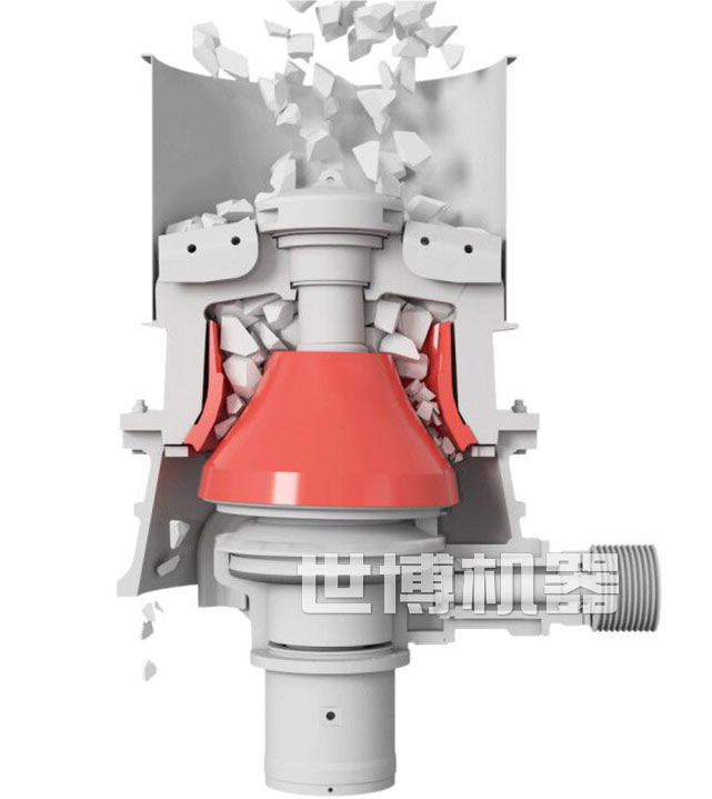 单缸液压圆锥破碎机的工作原理是通过电机的旋转带动联轴器,转动轴和圆锥部在轴心线下使偏心轴做周期性旋摆运动。在物料从进料口进入破碎腔后,经过偏心轴和轧臼壁的挤压、研磨、揉搓后达到连续破碎的目的。