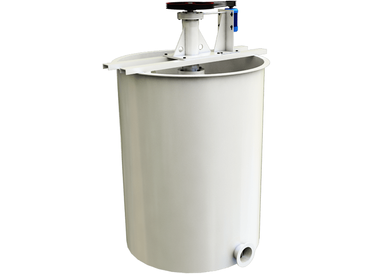 搅拌桶是由槽体、电机、固架、联轴器、减速机、皮带、横梁支架、搅拌叶轮等部件组成。搅拌桶主要用于浮选前的搅拌,由电动机三角带传动带动叶轮旋转,搅拌桶将药物和矿浆充分搅拌、混合均匀,是增加药剂作用反应时间、强化药物反应质量的必要设备。广泛适用于选矿业、各种化工业中浓度不大于30%及矿石密度不大于3.5的矿浆与浮选药剂的搅拌。