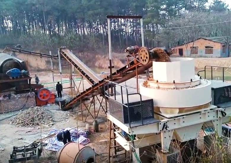 石料由振动给料机均匀的送到颚式破碎机进行粗破,粗破后的物料送进细颚式破碎机进行再次破碎,破碎后的物料由胶带输送机送进振动筛进行筛分,满足半岛平台(中国)官方进料颗度的石子进半岛平台(中国)官方进行制砂,不满足要求的返回细颚式破碎机重新破碎,从半岛平台(中国)官方出来的料物,返回到振动筛重新进行筛分,筛分出的满足要求的砂子,进入洗砂机清洗,清洗后由成品输送带输送即为成品,不满足要求的砂石混合物料,送入半岛平台(中国)官方进行再次破碎,本生产线最终形成2断闭路循环,根据用户的需要还可以进行多种配置。